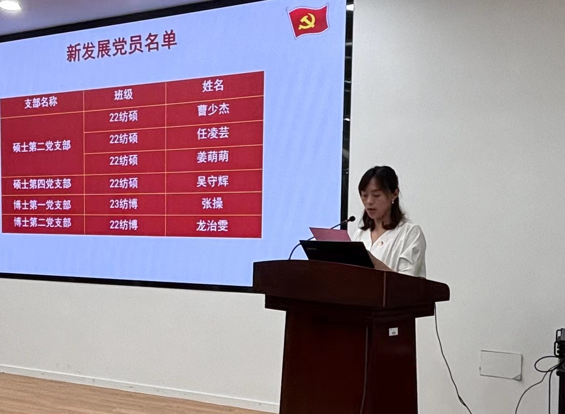 会议在庄严的《国际歌》中拉开帷幕。张志新宣读了2023年9月至2024年6月新发展党员名单。随后,面对鲜红的党旗,杨莉勤带领32位新发展党员一起高举右拳,庄严宣誓,在座老党员重温入党誓词。誓词句句千钧,振奋人心,党员同志们以铿锵有力的誓言表达对党的忠诚和为共产主义事业奋斗终身的决心。
