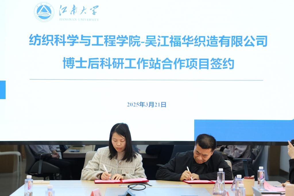 会上举行了合作签约仪式。张菁燕和周蕾分别代表双方党委签署了党建共建协议,吕婧和吴江福华织造有限公司总经理张长建分别代表校企签署了博士后科研工作站合作项目协议。