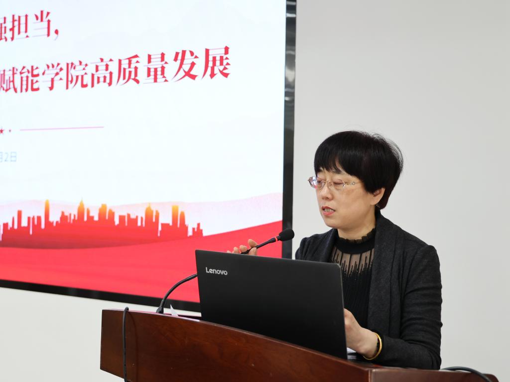 张菁燕作《明责守纪强担当,以全面从严治党新成效赋能学院高质量发展》政治理论领学报告。内容包括传达学习二十届中央纪委四次全会精神、传达学习学校2025年全面从严治党工作会议精神、解读学校和学院深入贯彻中央八项规定精神学习教育的实施方案、介绍今年学校全面从严治党工作重点等。