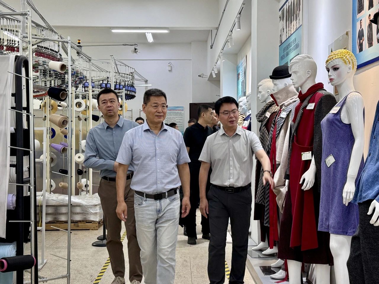副院长马丕波教授和贺海军副教授的陪同下,西京医院专家团队实地考察了针织研究中心的经编、纬编和横编三大实验平台,详细了解了中心在医用纺织材料领域的创新成果和科研设施建设情况,双方就智能纺织制造技术、新型医用结构材料等领域的研发进展进行了深入交流。