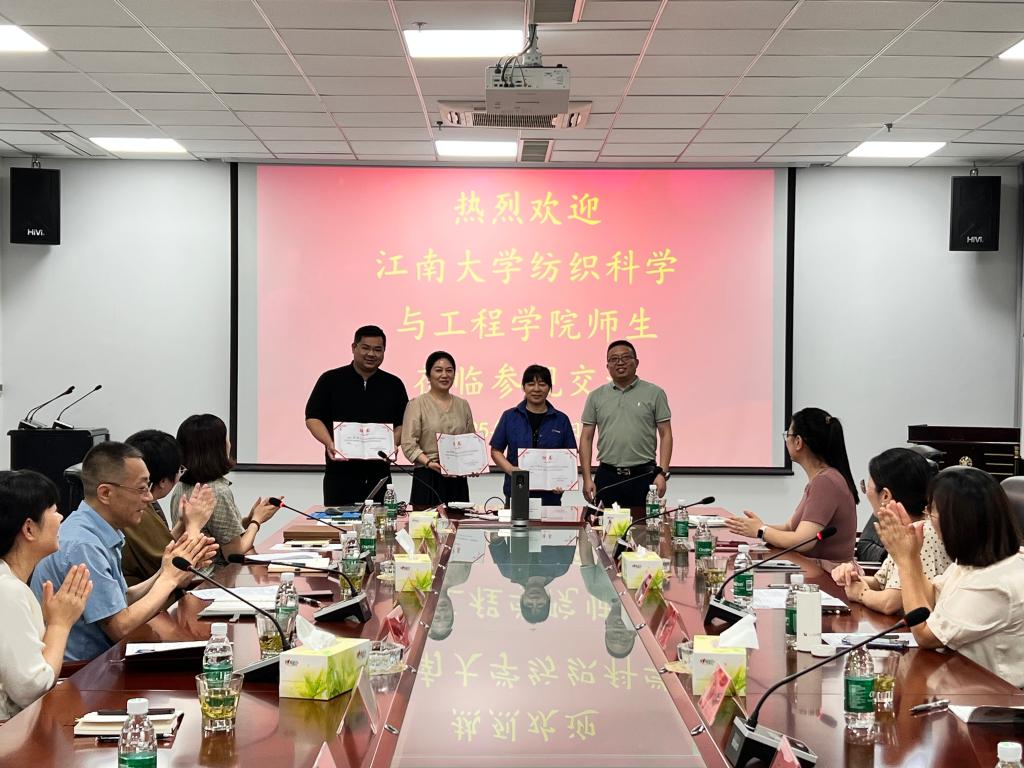 张丽平从专业学科特色、人才队伍建设、科研创新成果三个方面展开,详细介绍了学院近年来发展历程,期待持续深化合作共同培养符合行业需求的创新型、应用型人才。杨莉勤就企业人才需求做深入调研交流,期望构建校企“双向赋能”育人新格局,凝聚育人合力,着力培养纺织拔尖创新人才。最后,杨莉勤向企业颁授色情导航