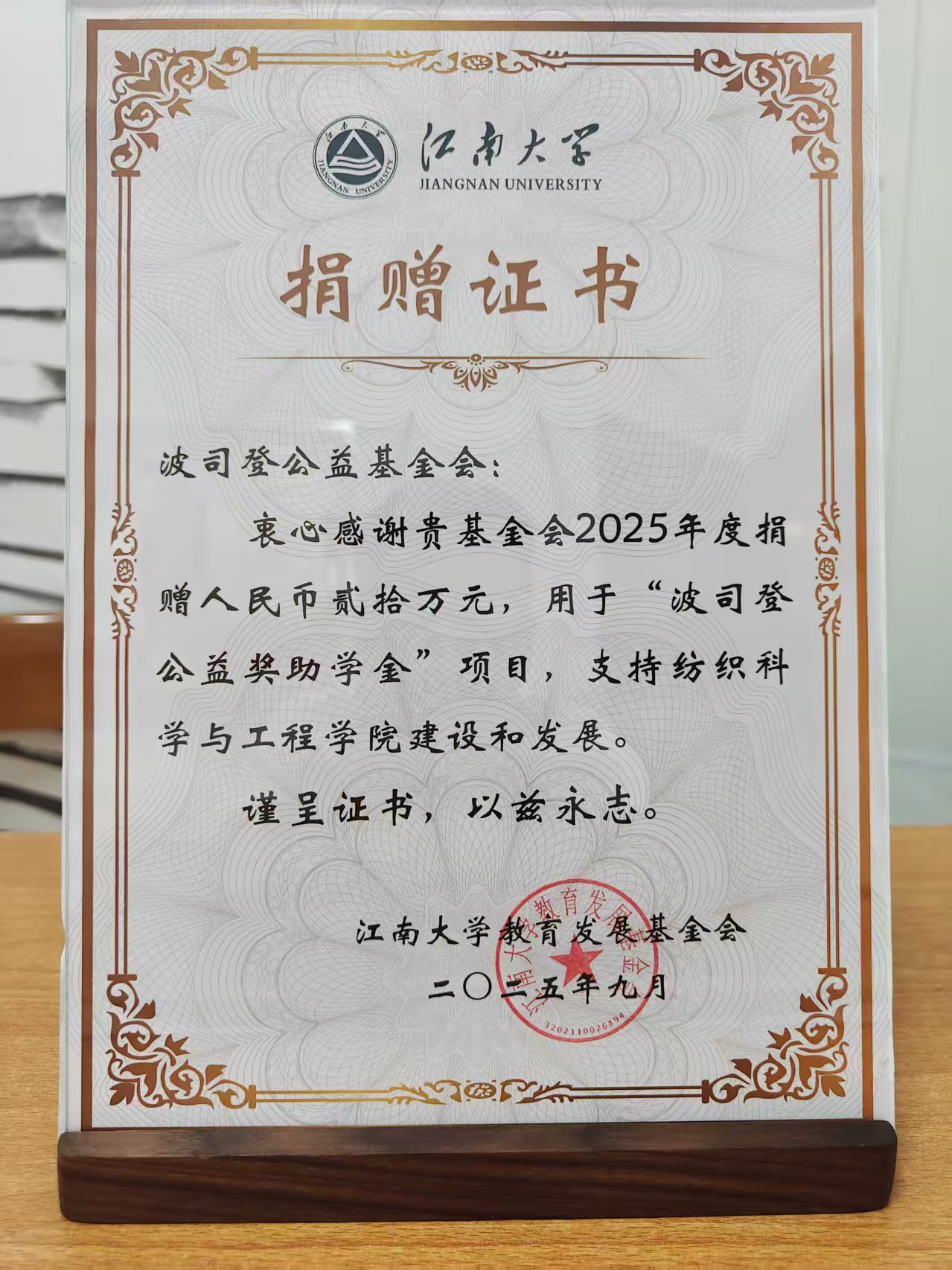 “波司登公益奖助学金”第三轮捐赠协议,每年捐赠20万元用于资助纺织服装类品学兼优、家庭经济困难学生。