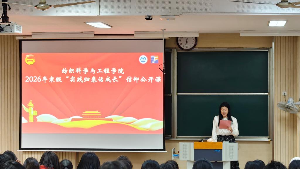 在本次寒假“冬日织悟实践行”社会实践中,各团队围绕不同主题开展了一系列紧扣时代主题,内容丰富形式多样的社会实践活动。“纺铸初心,寻迹织路”实践团成员们通过实地走访和沉浸式学习,在历史与现实的交汇中感悟初心使命,汲取奋进力量。张闻天特称团支部2024级纺织创新班以“深化同心固边”为主题,走进红色纪念馆、爱国主义教育基地,深化对总体国家安全观的理解,让青春在践行爱国使命的路上步履不停。“寻‘纺’文化根脉,讲好中国故事”实践团走进博物馆、非遗工厂等文化场馆,触摸历史温度,溯源文明根脉,以青春脚步丈量文化传承之路,用年轻声音讲述时代故事。“文脉传承,薪火相传”实践团以传承中华优秀传统文化为初心,在行走中探寻文化根脉,在实践中感悟匠心传承,以纺织青年的热忱与行动,书写文化传承的新篇章。钱之光特称团支部2025级纺织创新班以红色精神赋能,创新实践筑梦,将红色研学,专业实践,产业创新有机融合,在实践中感悟创新力量,明确青春使命。“纺承乡土韵,织就振兴图”实践团将传统纺织技艺传承和乡村人文关怀深度融合,让纺织文脉在乡土间焕发新活力,为乡村振兴注入青春动能。“经纬织梦,红色薪火”实践团以纺织学子的独特视角,探寻红色印记、感悟精神力量,让红色基因和纺织精神双向奔赴、代代相传。基层服务治理实践团走进一线,在入户走访中倾听民生,在志愿服务中脚踏实地,在文明治理中守正创新。八位实践团的团队代表依次登台分享他们的实践故事,用鲜活案例展现知行合一的青春力量。