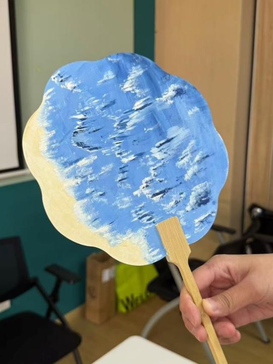 活动现场暖意融融。素净的伞面与扇面静静铺开,丙烯马克笔、水彩颜料等工具一应俱全,还有叶片、花瓣等小物件可供取用,为创作搭建起温柔的舞台。无需专业技法,大家随心落笔:有人细描柳丝拂水的轻柔,有人勾勒桃李争妍的热烈,将心事藏于色彩之中,把烦恼随春风消散。