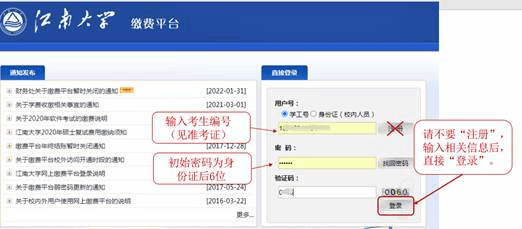 财务处”,在“业务办理”中选“学生缴费”。 用户名及初始密码均为考生编号(15位,下载准考证后查看)和身份证后6位。 |